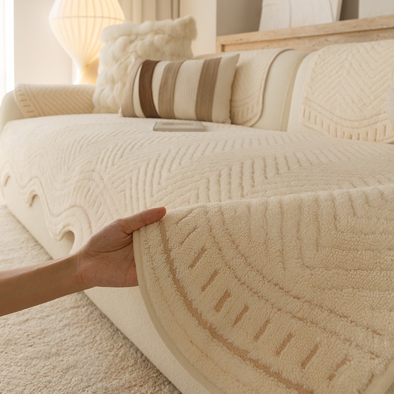 This sofa seat cover features a textured woven surface with a soft, sculpted woven texture, providing both comfort and visual appeal. The clean wave-like edge design adds a subtle decorative flair, while the neutral tone makes it versatile for various living room decors. Ideal as a protective throw for sofas, it helps keep furniture clean while elevating the look of your space. Suitable for use throughout the year, this cover is perfect for fabric or leather sofas, including loveseats and sectionals.