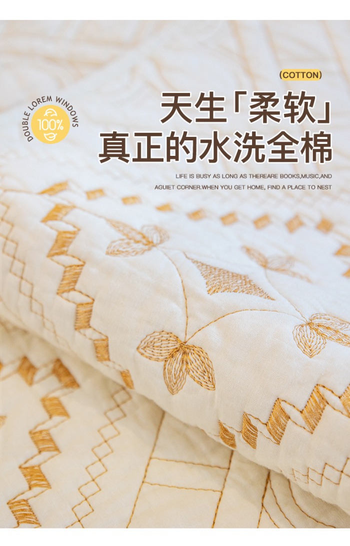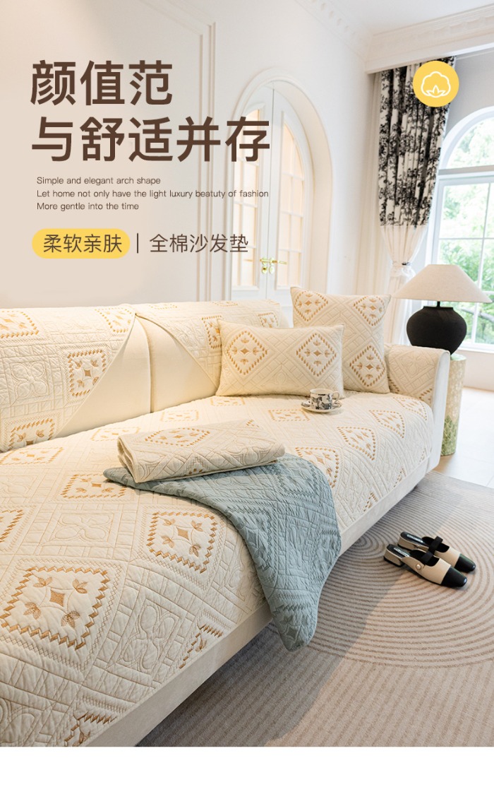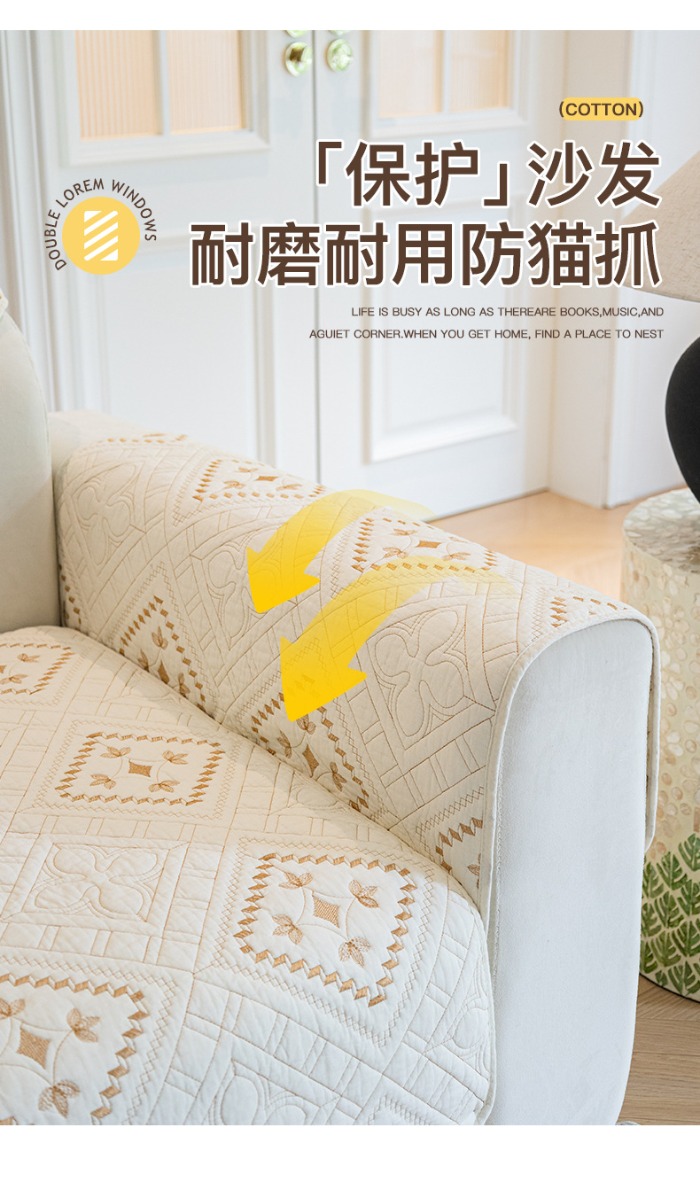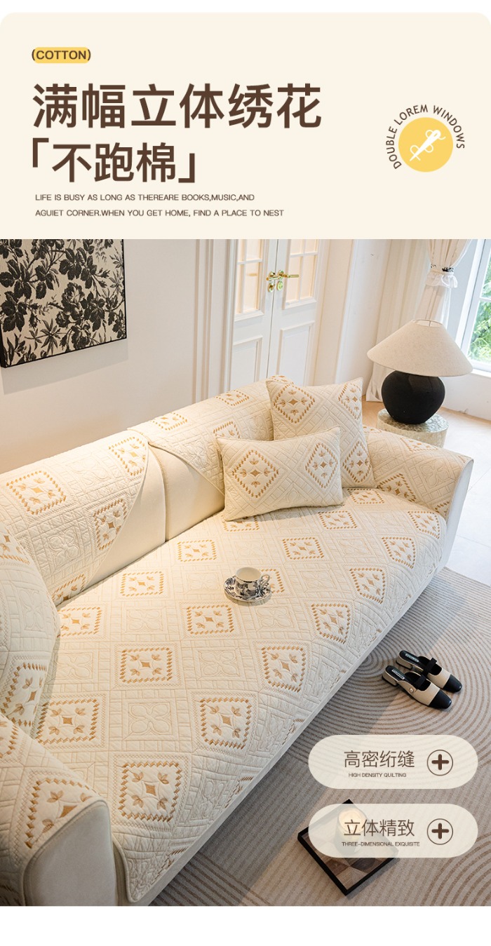 This quilted cotton sofa cover brings a regal touch to your living room with its exquisite baroque-inspired embroidery. Crafted from 100% natural cotton, it features a soft, breathable surface and a plush cotton-padded interior for extra comfort. The intricate palace-style pattern showcases ornamental florals and arches, adding timeless elegance to any sofa setup.