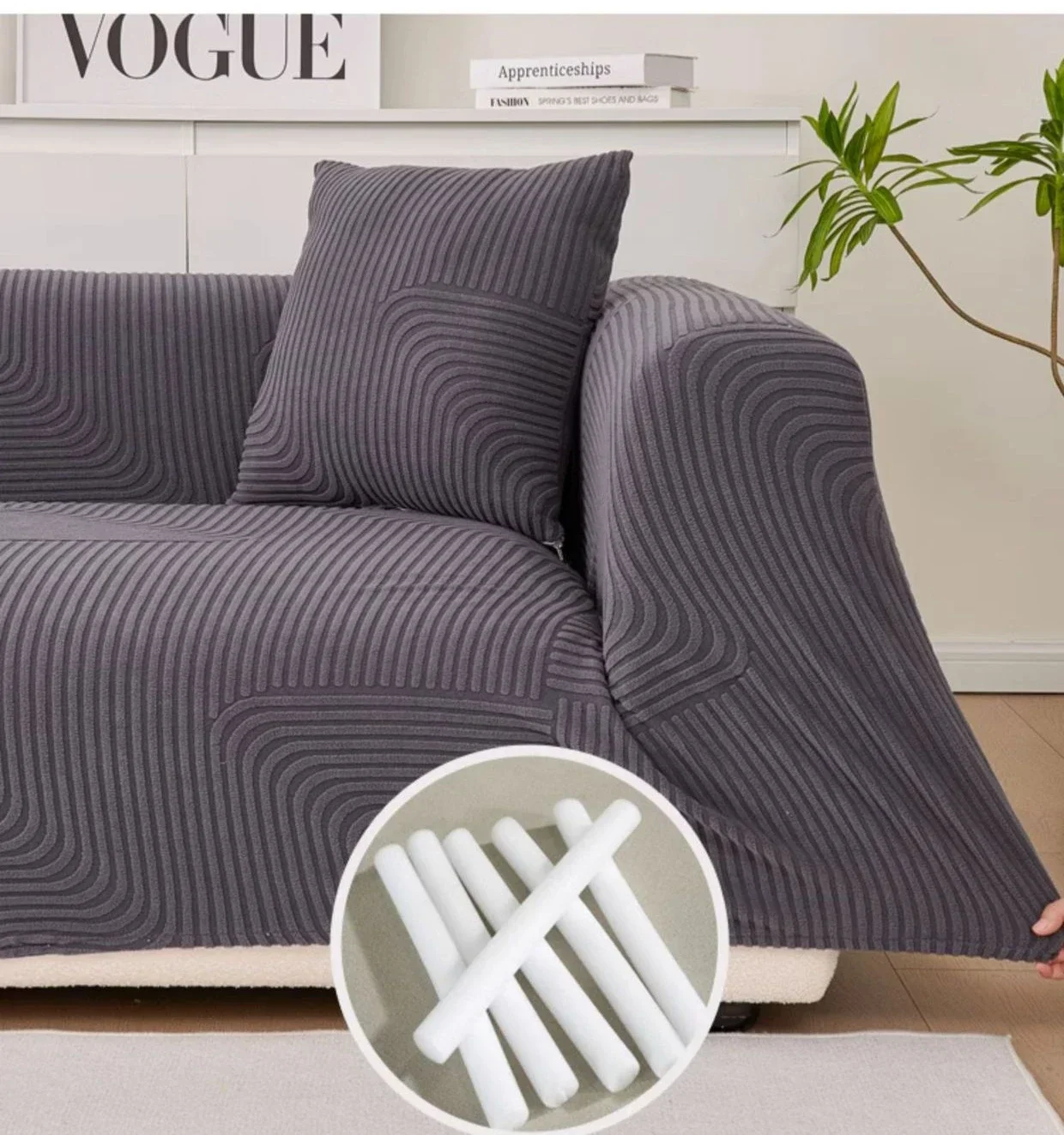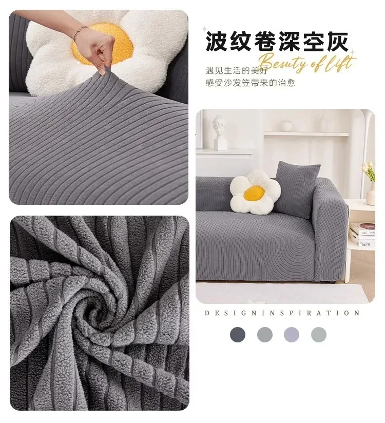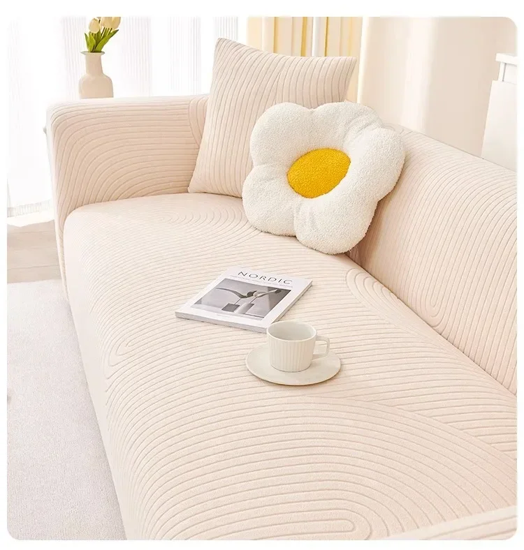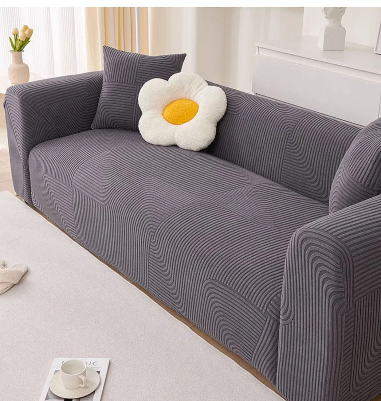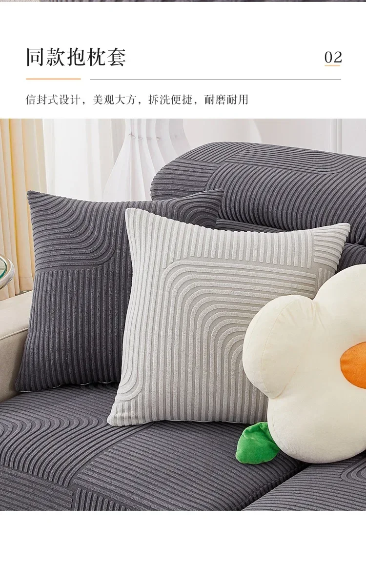 This stretch sofa slipcover features a modern geometric wave pattern with a textured finish. Made from soft, elastic fabric, it provides a snug fit and protects against spills, stains, and pet scratches. Its stylish design enhances any living space, making it perfect for refreshing old furniture or safeguarding new pieces.