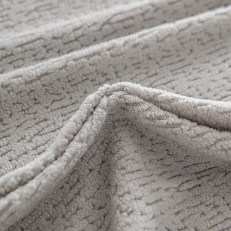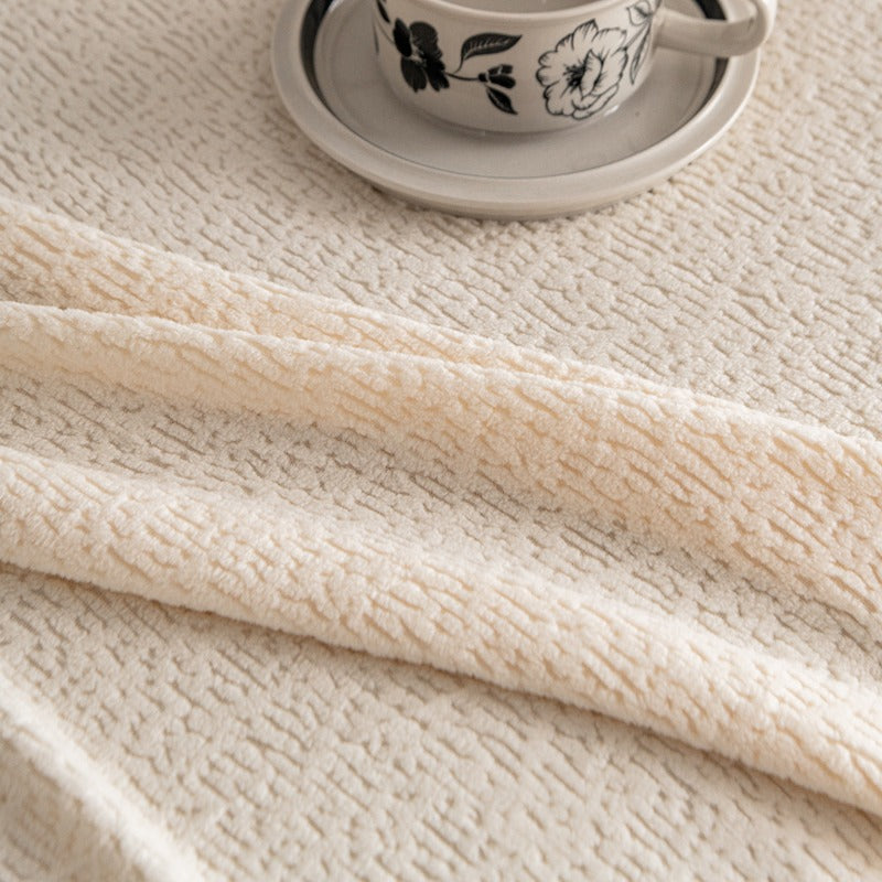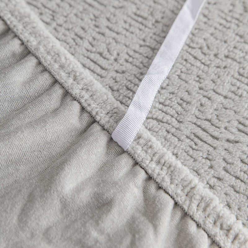 This sofa cover is crafted from a jacquard fabric, featuring a distinct, three-dimensional texture composed of irregular vertical stripes. The material is integrated with high-stretch fibers, enabling it to conform tightly to the contours of a sofa for a tailored appearance. An elastic band is sewn into the perimeter of the hem to secure the cover and prevent it from shifting during use. Functionally, it serves as a protective barrier against daily wear, stains, and pet fur, while also offering a significant aesthetic update to existing furniture.