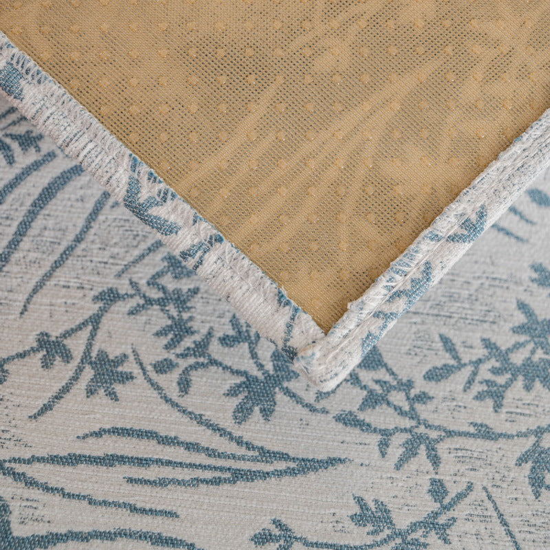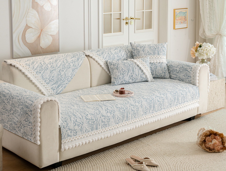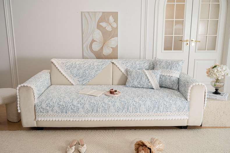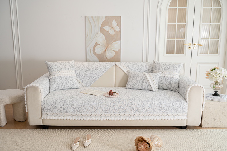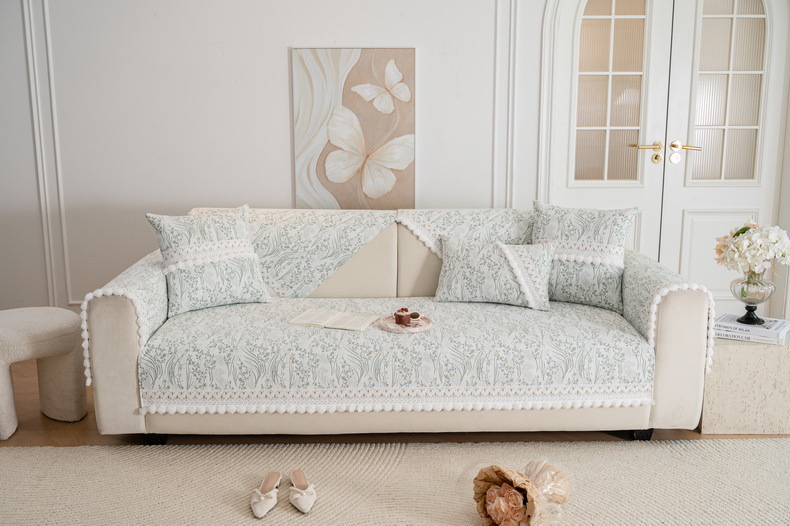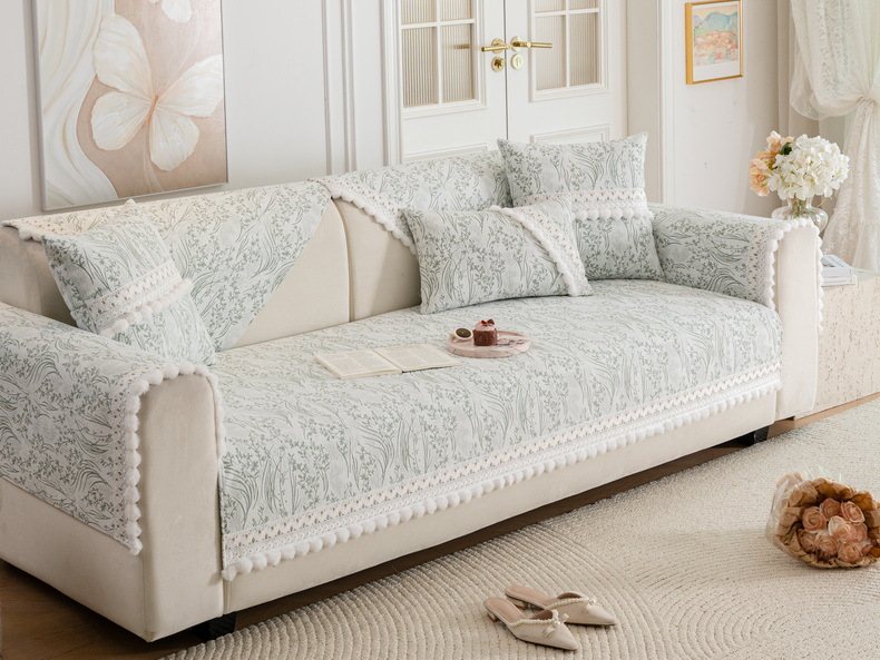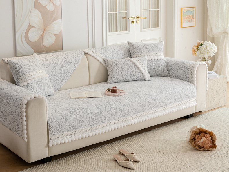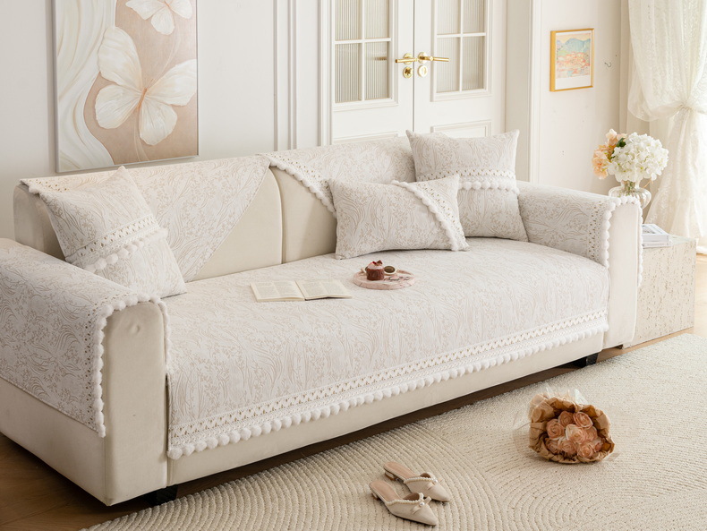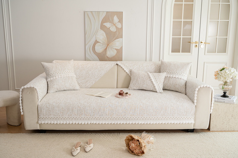 This sofa cover is crafted from a soft, breathable chenille fabric with a natural drape and a finely raised texture. The delicate raised stripes add depth and tactile interest without overwhelming the room. Decorative pom pom fringe and lace trim along the edges lend a romantic and refined accent, perfectly suited for modern or light European-style interiors. A dense silicone dot backing keeps the cover securely in place, while the modular design allows flexible coverage for seat cushions, backrests, and armrests. Both practical and beautiful, this cover protects your sofa while elevating your home décor.